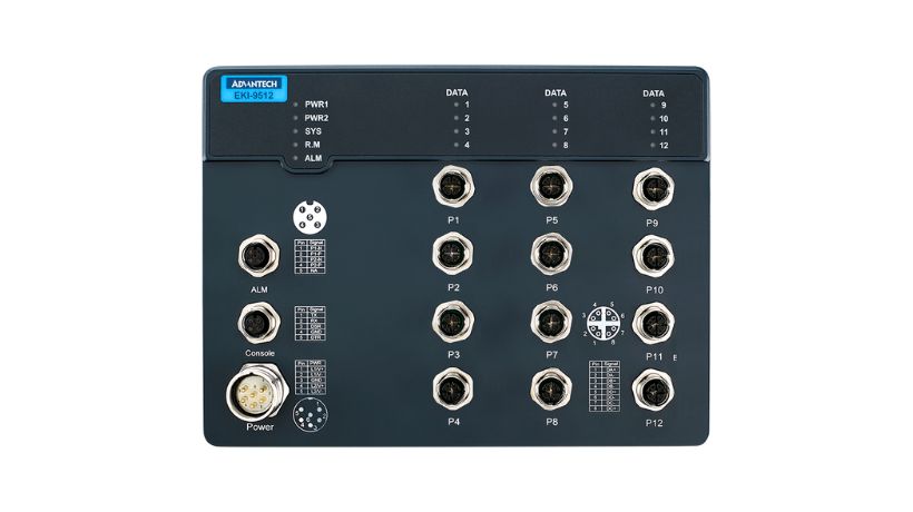 The Advantech EKI-9512G-4GMX-AE is a rugged, EN50155-compliant 12-port managed Gigabit Ethernet switch designed for railway, rolling stock, and harsh industrial environments. Built with a sealed IP67 aluminum housing and M12 connectors, this switch ensures secure and vibration-resistant connectivity where reliability is critical.
