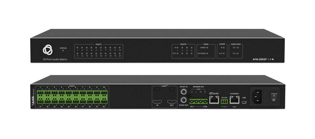 Equipped with powerful multi-channel DSP, built-in 2×60W @ 8Ω and 1×120W @ 70V/100V Class-D amplification, 4×4 Dante networking, and HDMI audio embedding/de-embedding, the AFM-20DSP delivers unmatched signal processing performance. Its advanced 32-bit DAC technology ensures flat frequency response, ultra-low distortion, and exceptional audio clarity.