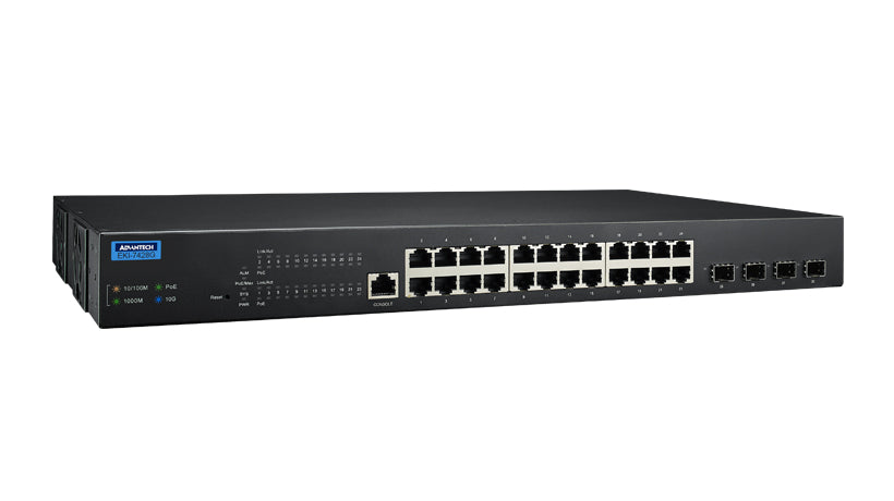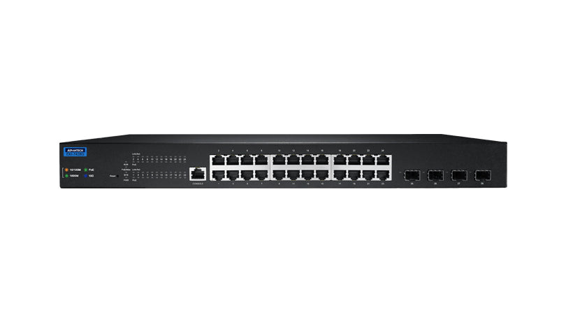 The Advantech EKI-7428G-4XP-AE is a high-performance Layer 2 managed industrial Ethernet switch designed for large-scale network infrastructures requiring both high-speed connectivity and robust Power over Ethernet support.