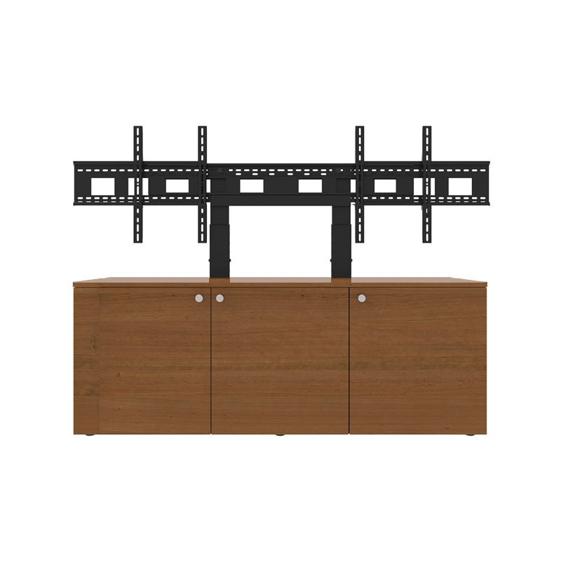 Crafted with premium veneer finishes and built on a robust steel frame, the credenza arrives fully assembled for fast, simplified installation. Upright extensions are available to increase mounting height for larger displays. Custom 4-, 5-, and 6-bay configurations can also be made to order to match your room design and technical requirements.