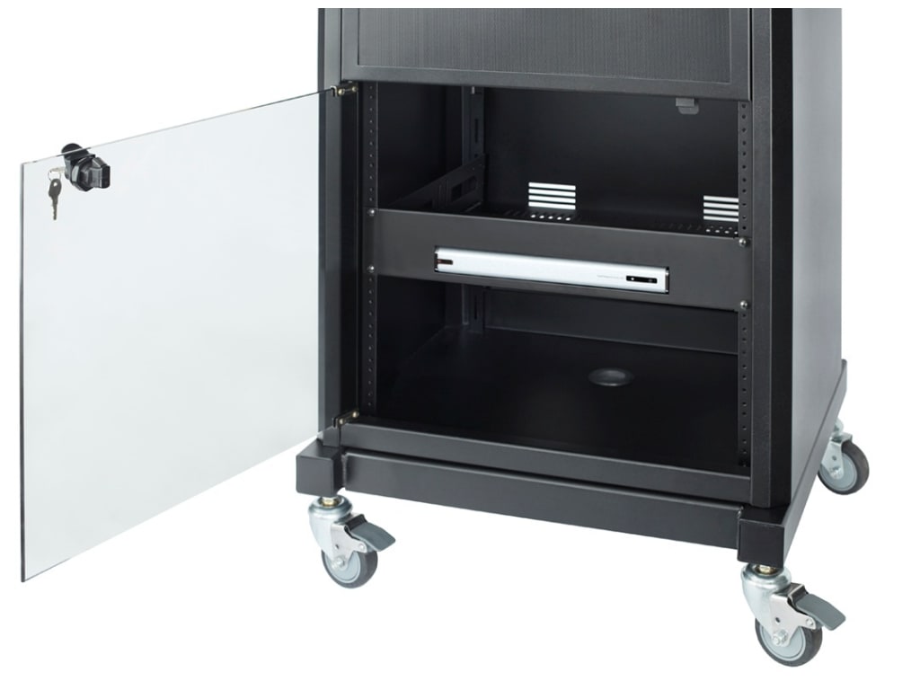 The AVTEQ GM-200P is a durable, feature-rich mobile AV cart engineered for rooms equipped with installed displays or projectors. Designed with flexibility and functionality in mind, it offers generous equipment storage with a 9RU front and rear rack system, an adjustable interior shelf, and efficient cable-management features to keep installations clean and organized.