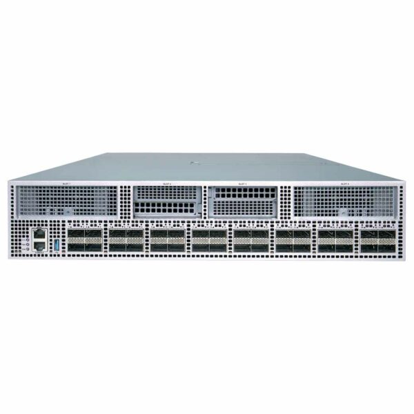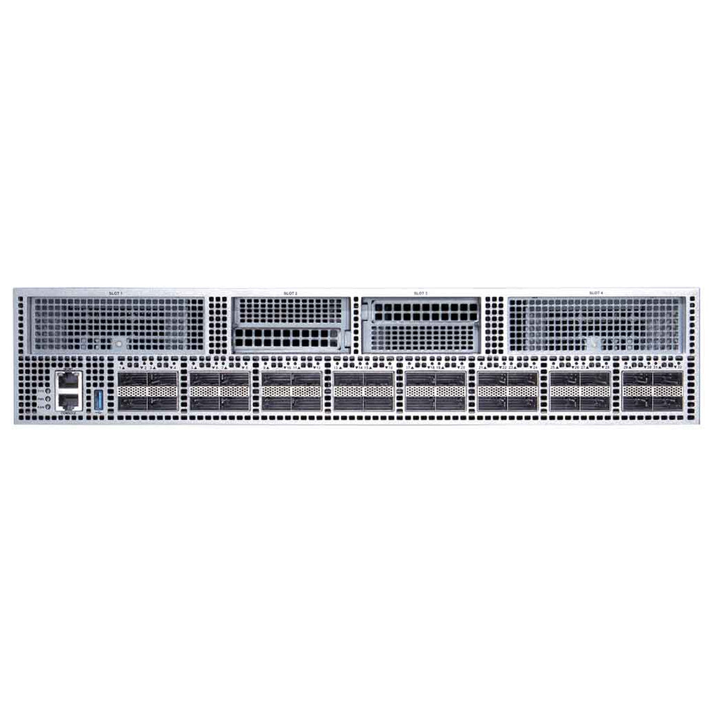 This 2RU appliance integrates 32 QSFP28 (100GbE) ports using the Intel® Barefoot Tofino 64Q chipset, achieving up to 6.4 Tbps switching capacity for data-intensive workloads. It comes equipped with four Intel® Stratix 10MX FPGA cards, each featuring 8GB HBM2 memory, enabling high-speed packet processing, AI/ML acceleration, and millions of HQoS sessions for advanced network visibility and control.