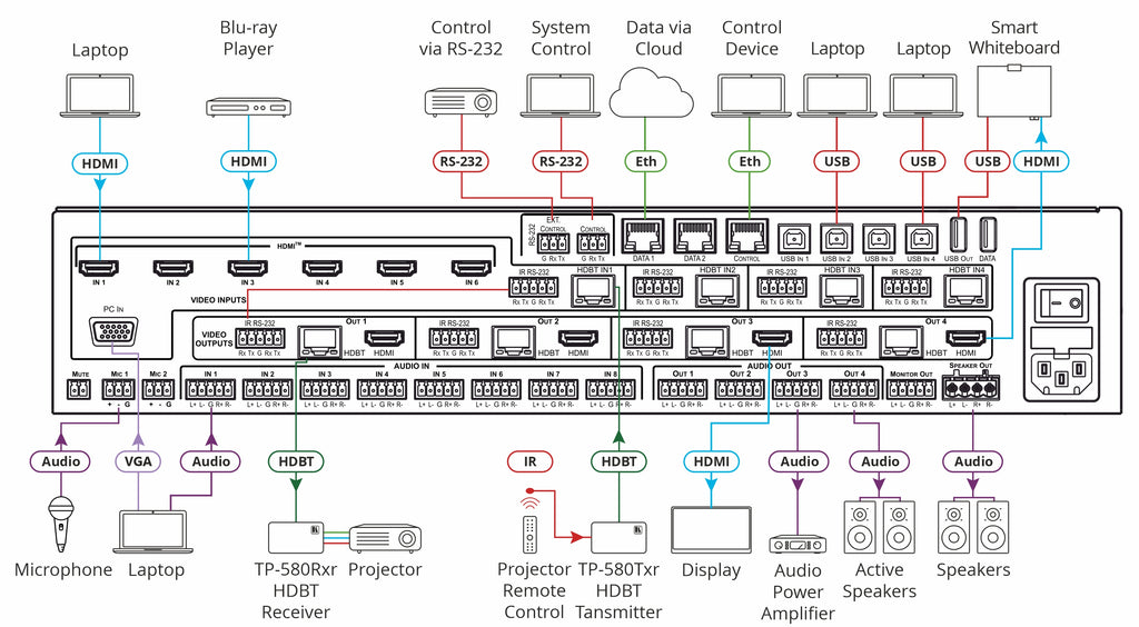 | Inputs | 6 HDMI; 1 VGA (PC); 4 HDBaseT; 8 Balanced Stereo Audio; 2 Unbalanced Mono Audio |
