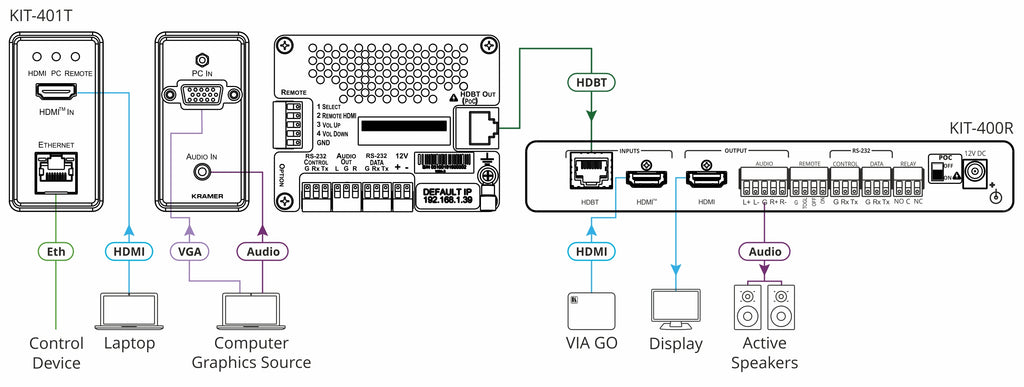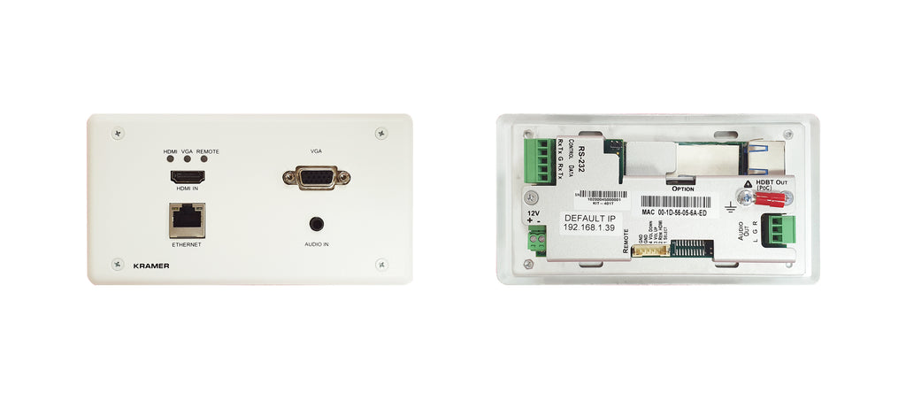 The KIT-401T wall-plate transmitter supports HDMI, VGA, and unbalanced audio inputs, while the KIT-400R receiver provides HDMI output, scaling, audio de-embedding, and advanced control capabilities. With simple auto-switching, intelligent EDID handling, PoC (Power over Cable), RS-232 extension, and seamless integration with Kramer Maestro room automation, this system minimizes setup time and streamlines user experience.