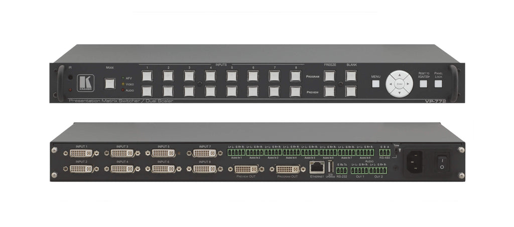 The Kramer VP-772/110V is an advanced 8-input dual scaler designed for professional presentations, rental and staging environments, live events, and installations that demand seamless switching, high-quality scaling, and powerful visual effects. Featuring PixPerfect™ scaling, K-IIT XL™ picture-in-picture technology, and support for up to 4K30 UHD output, this unit delivers smooth transitions, flexible multi-format connectivity, and precise image control for mission-critical workflows.