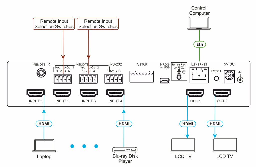| User Controls | Input selection, output mute, EDID capture, panel lock; HDCP DIP switches |