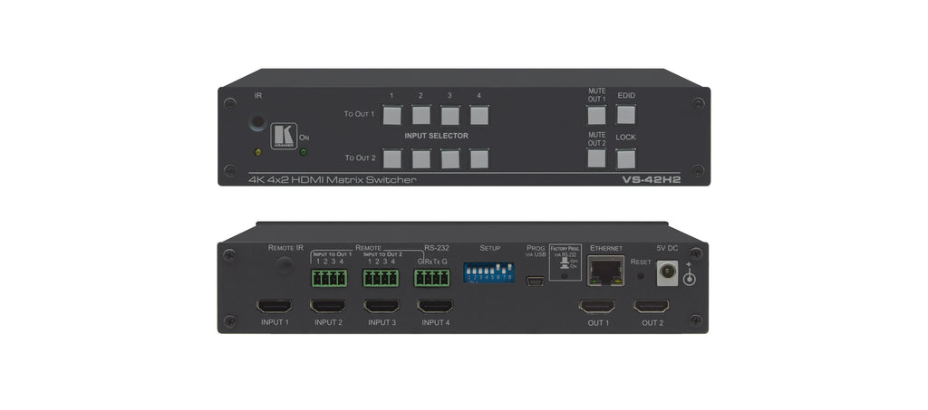 The Kramer VS-42H2 is a high-performance 4x2 HDMI matrix switcher designed for professional AV environments that require reliable 4K UHD signal routing. Supporting 4K@60Hz (4:4:4) with HDR and full HDCP 2.2/1.4 compliance, this matrix allows you to route any of four HDMI sources to one or both outputs simultaneously—ideal for conference rooms, classrooms, digital signage, and multi-display installations.