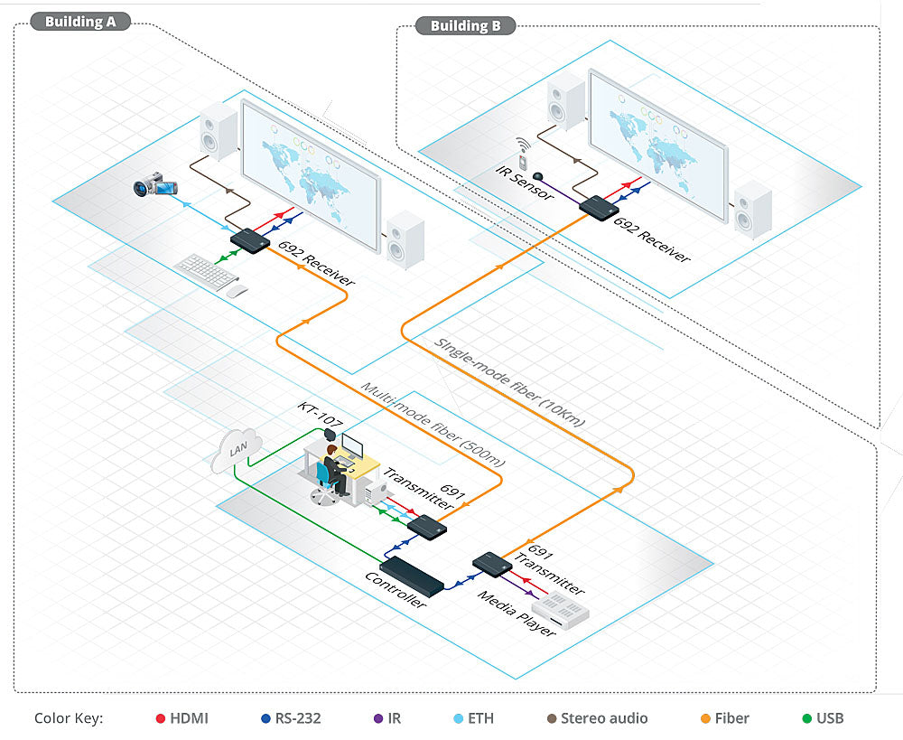 Designed for durability and easy integration, the unit features status LEDs, a built-in web UI, remote management, and fanless half-rack construction for efficient installation. Whether extending AV signals across a campus, between buildings, or throughout large facilities, the Kramer 691 provides unmatched performance and long-reach connectivity.