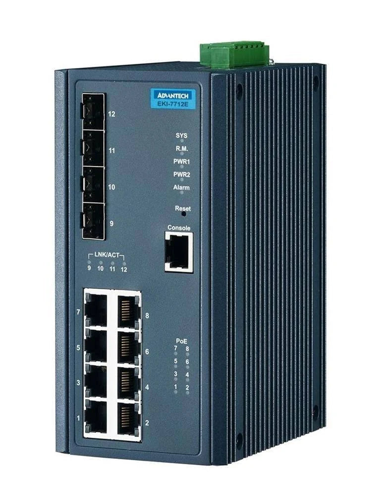 The Advantech EKI-7712G-2FV-AE is a rugged, high-performance Layer 2 managed industrial Ethernet switch designed for bandwidth-heavy and long-distance applications. It features 8 Gigabit Ethernet ports, 2 Gigabit SFP uplinks, and 2 VDSL2 ports, allowing Ethernet connectivity to be extended over existing 2-wire cabling—ideal for scenarios where rewiring is not feasible.