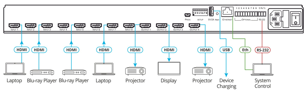 The Kramer VS-84H2 is a professional-grade 8x4 HDMI matrix switcher designed for modern 4K/60 (4:4:4) AV environments. Delivering clean, fast switching and flexible audio routing, it enables seamless distribution of high-quality video and audio to multiple displays in corporate, education, hospitality, and command-and-control applications.