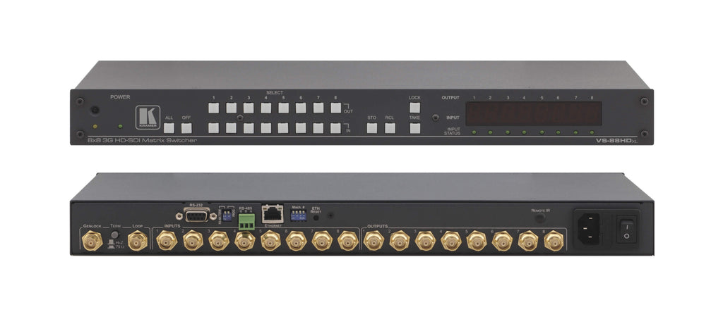 The Kramer VS-88HDXL/110V is a high-performance 8x8 3G HD-SDI matrix switcher designed for broadcast, production, and professional AV environments that demand uncompromising signal integrity. Engineered for reliability, it supports multi-standard SDI, HD-SDI, 3G HD-SDI, and dual-link HD-SDI formats, making it an ideal routing solution for studios, OB vans, post-production suites, and advanced monitoring setups.