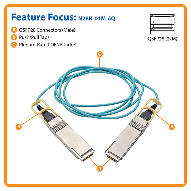 The Eaton Tripp Lite N28H-01M-AQ is a high-performance QSFP28 to QSFP28 Active Optical Cable (AOC) designed for ultra-fast 100Gb Ethernet connections in data centers and enterprise environments. This 1-meter multimode cable combines four full-duplex 25 Gbps lanes into a single compact assembly, delivering an aggregated bandwidth of up to 100 Gbps.