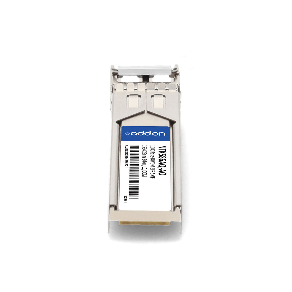 The AddOn Ciena® NTK586AQ Compatible TAA 1000Base-DWDM SFP Transceiver delivers reliable, high-performance optical networking for long-distance data transmission. Engineered for Gigabit Ethernet and Fibre Channel applications, this hot-swappable SFP transceiver supports data rates up to 1.25 Gbps and transmits over single-mode fiber (SMF) at a wavelength of 1534.25 nm, achieving distances up to 80 km. Built to meet INF-8074 and SFF-8472 standards, it features a duplex LC connector, digital optical monitoring (DOM) support, and robust ESD and EMI protection. Fully compatible with the equivalent Ciena® module, it has been rigorously tested and serialized to ensure seamless integration and identical performance. TAA compliant and RoHS certified, this transceiver is ideal for metro, enterprise, and access networks where reliability, scalability, and performance are paramount.