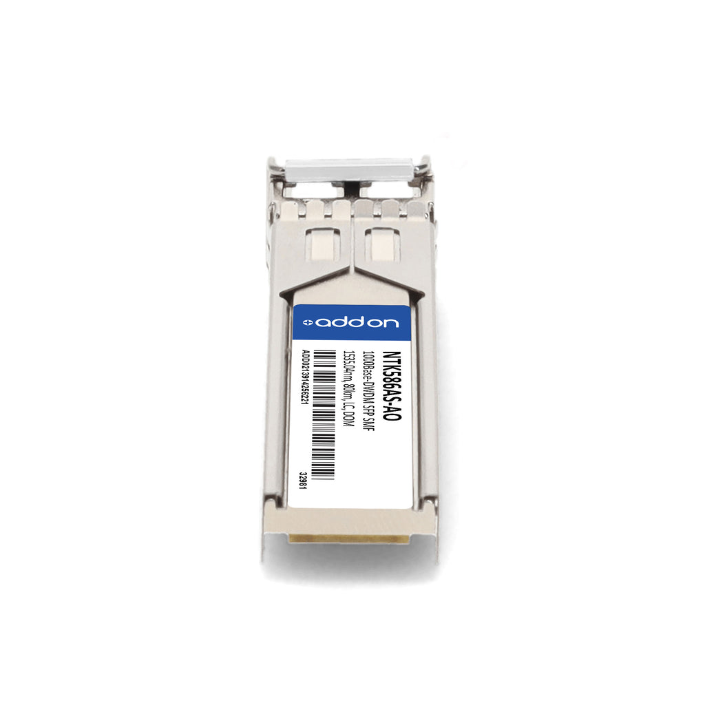 The AddOn Ciena® NTK586AS Compatible TAA 1000Base-DWDM SFP Transceiver delivers reliable Gigabit Ethernet and Fibre Channel connectivity over long distances up to 80km on single-mode fiber (SMF). Operating at a wavelength of 1535.04nm with 100GHz channel spacing, this transceiver features a duplex LC connector and supports Digital Optical Monitoring (DOM) for real-time parameter tracking. Designed for access, metro, and enterprise networks, it ensures seamless compatibility with Ciena® equipment and meets INF-8074 and SFF-8472 standards. The hot-pluggable, RoHS-compliant module offers excellent ESD protection, low EMI, and robust performance across a commercial temperature range of 0°C to 70°C. TAA compliance ensures suitability for U.S. government procurement, and each unit undergoes stringent testing and serialization to guarantee reliable operation and interoperability.