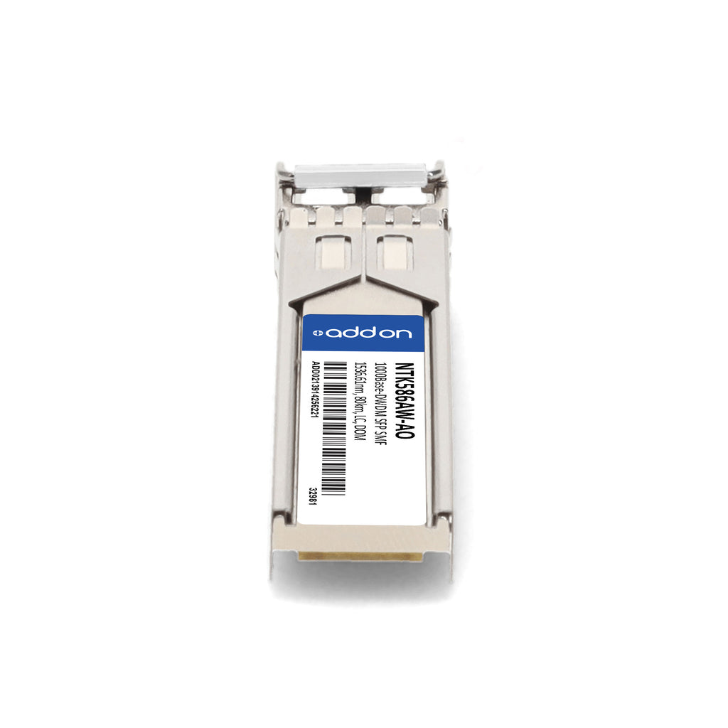 The AddOn Ciena® NTK586AW Compatible TAA 1000Base-DWDM SFP Transceiver is a high-performance optical module designed for reliable Gigabit Ethernet and Fibre Channel applications across metro, access, and enterprise networks. Operating at a wavelength of 1536.61nm, this transceiver delivers 1000Base-DWDM throughput up to 80km over single-mode fiber (SMF) via a duplex LC connector. It fully complies with INF-8074 and SFF-8472 standards and supports Digital Optical Monitoring (DOM) for real-time diagnostics. Featuring excellent ESD protection, robust EMI shielding, and RoHS compliance, this hot-swappable, easy-to-install module is 100% compatible with the original Ciena® transceiver and backed by AddOn’s lifetime warranty.