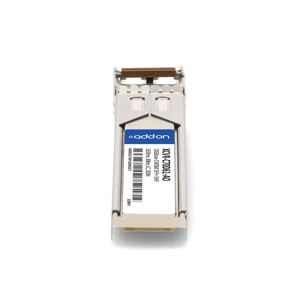 The AddOn Ciena® XCVR-C70D61 Compatible TAA 10GBase-CWDM SFP+ Transceiver is a high-performance optical module designed to deliver reliable 10 Gigabit Ethernet connectivity over single-mode fiber (SMF) at distances up to 70 km. Operating at a 1610 nm wavelength and equipped with a duplex LC connector, this hot-pluggable transceiver supports Digital Optical Monitoring (DOM) for real-time performance diagnostics and system management. Engineered for seamless compatibility with Ciena® networking equipment, each unit is uniquely serialized, application-tested, and guaranteed for full interoperability. With robust features like SFF-8432 and SFF-8472 compliance, low EMI metal housing, excellent ESD protection, and RoHS compliance, this transceiver is ideal for metro networks, enterprise backbones, mobile fronthaul (CPRI/OBSAI), and high-capacity data center interconnects.