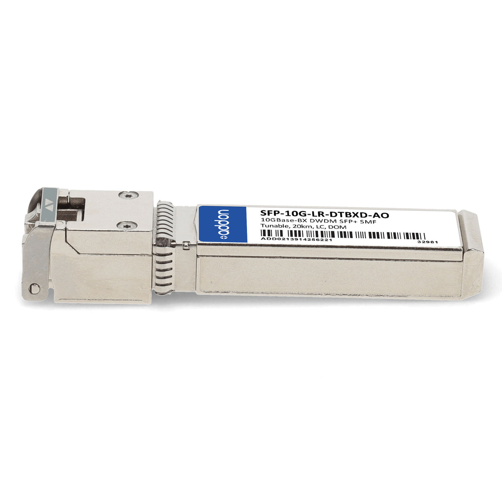 The AddOn Cisco® SFP-10G-LR-DTBXD-AO is a 10G-BX DWDM tunable SFP+ transceiver designed for high-performance, bidirectional optical communication over single-mode fiber (SMF) with a reach of up to 20km. Supporting data rates from 1.2 Gb/s to 11.3 Gb/s, this hot-pluggable module operates within the 1530 nm to 1565 nm wavelength range and features a monolithic tunable BOSA for 40 dual-band point-to-point links on 100 GHz ITU grids. It is equipped with auto-tuning technology and built-in Digital Optical Monitoring (DOM) for real-time diagnostics. TAA-compliant and 100% compatible with the equivalent Cisco® transceiver, it ensures seamless integration and reliable performance for metro, access, and enterprise DWDM networks. Each unit is uniquely serialized, tested for interoperability, and backed by a limited lifetime warranty.