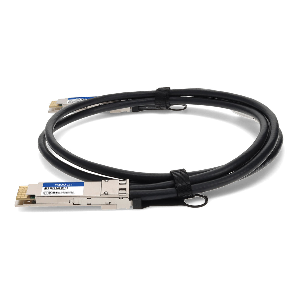 The AddOn Juniper Networks® QDD-400G-DAC-3M is a high-performance 400GBase-CU direct attach cable designed for data centers, enterprise networking, and high-performance computing environments. This QSFP-DD to QSFP-DD passive twinax cable supports a maximum reach of 3 meters (9.8 ft) and is compliant with QSFP-DD MSA specifications. It ensures reliable high-speed connectivity with 25G and 50G PAM4 electrical data rates per channel, excellent EMI/EMC shielding, and low-loss signal integrity.