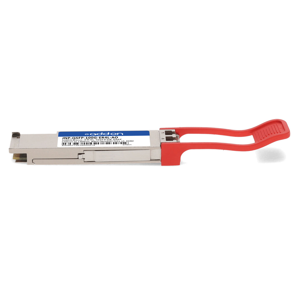 The AddOn Juniper Networks® QSFP-100G-ER4L compatible QSFP28 transceiver delivers reliable 100GBase-ER4L throughput for high-performance networking environments. Supporting transmission distances of up to 40km over single-mode fiber (SMF), it operates across a wavelength range of 1295nm to 1309nm via a standard LC connector.