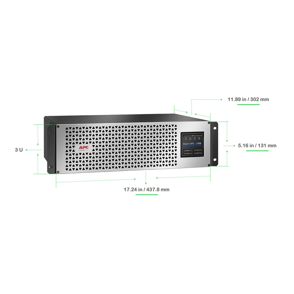 Ensure maximum uptime and critical load protection with the APC Smart-UPS SMTL1500RM3UC. This compact, 3U rackmount UPS delivers 1440VA/1350W of pure sine wave power using line interactive topology and features a long-lasting lithium-ion battery with up to 10 years of life. Designed for edge environments, back offices, and network closets, this short-depth UPS includes 6 NEMA 5-15R outlets, SmartConnect cloud monitoring, and a SmartSlot for network management cards.