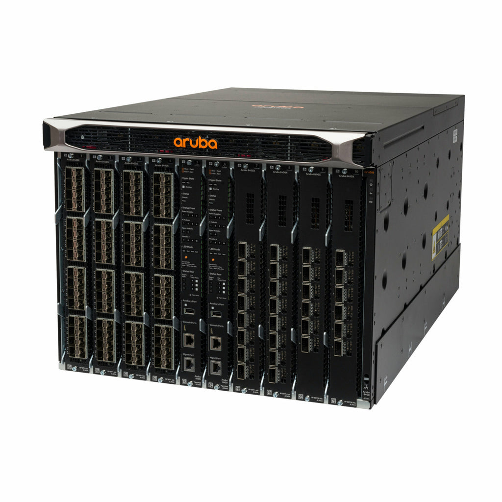 The HPE Aruba Networking CX 8400 Series is a high-performance, modular switch designed for enterprise campus cores and data center aggregation. This powerful 8-slot chassis bundle (JL376A#ABA) includes 1x Management Module, 3x Power Supplies, 2x 8400X Fabric Modules, 1x 32-port 10G Module, and 1x 8-port 40/100G Module.