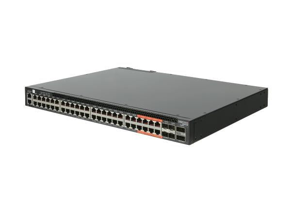 The Edgecore AS4610-54P is a high-performance Gigabit Ethernet Layer 3 managed PoE+ switch, engineered for modern enterprise and campus networks. Designed to power connected devices such as IP phones, wireless access points, and surveillance cameras, it delivers a total PoE budget of 1650W across 48 Gigabit PoE+ ports, ensuring optimal performance and simplified deployment using existing Cat 5/6 infrastructure.