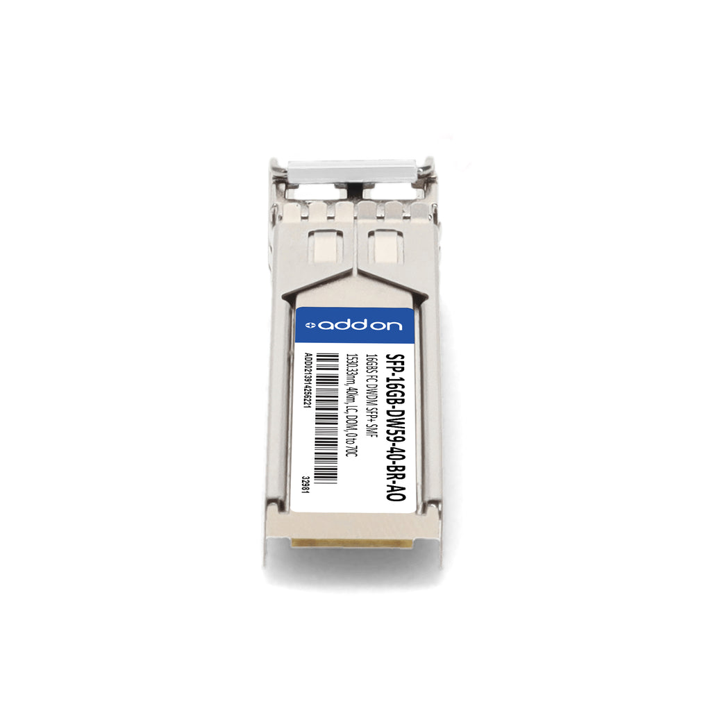 The AddOn Brocade® Compatible SFP-16GB-DW59-40-BR-AO is a high-performance 16GBase-DWDM Fibre Channel SFP+ transceiver designed for long-distance data transmission up to 40km over single-mode fiber (SMF). Operating on ITU-T Channel DW59 with a 100GHz spacing and a 1530.33nm wavelength, this module ensures reliable connectivity for storage, data center, and enterprise applications. It features a cooled EML transmitter, PIN receiver, and a duplex LC connector, providing seamless integration into existing network infrastructures. With support for digital optical monitoring (DOM), users gain real-time visibility into critical operating parameters. The transceiver is hot-swappable, RoHS compliant, TAA compliant, and guaranteed 100% compatible with Brocade® equipment. Each unit is uniquely serialized, rigorously tested for performance and compatibility, and backed by AddOn’s limited lifetime warranty.