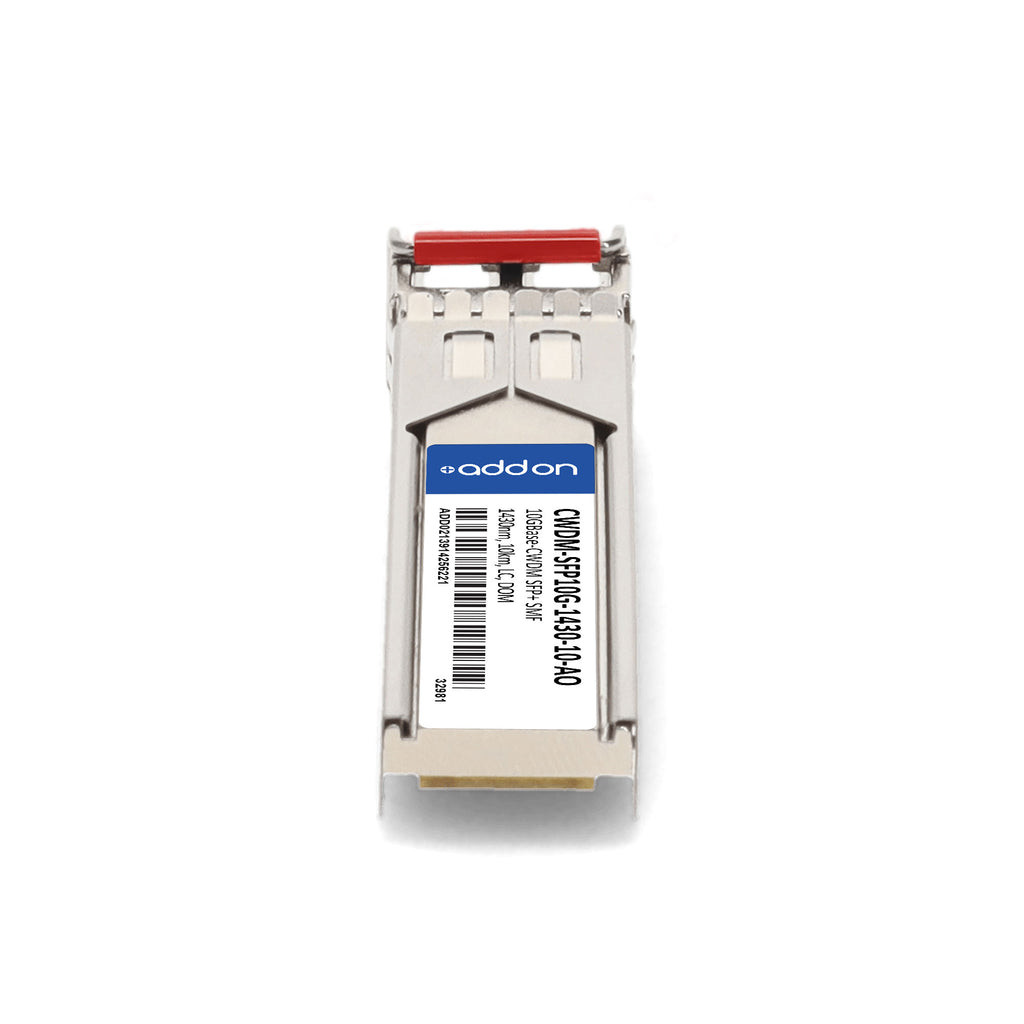 The AddOn Cisco® CWDM-SFP10G-1430-10 Compatible TAA 10GBase-CWDM SFP+ Transceiver delivers high-performance 10-Gigabit connectivity over single-mode fiber (SMF) with a reach of up to 10km using a 1430nm wavelength. Designed for seamless integration into Cisco® networking environments, this hot-pluggable SFP+ module uses an LC connector and supports Digital Optical Monitoring (DOM) for real-time performance management. Each unit is programmed, uniquely serialized, and rigorously tested for data traffic and application compatibility to ensure plug-and-play functionality identical to the OEM part. Built to meet or exceed OEM specifications, this transceiver complies with MSA standards and is TAA-compliant, making it suitable for government and enterprise network deployments. All AddOn products are backed by a limited lifetime warranty.