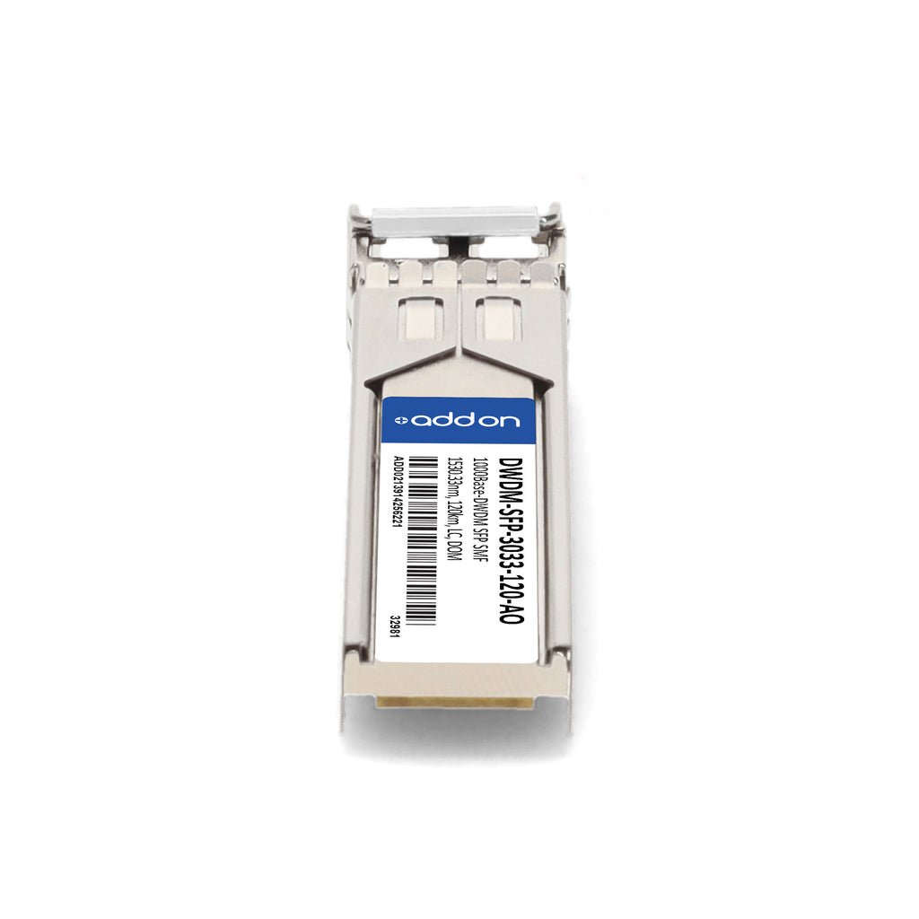 The AddOn Cisco® DWDM-SFP-3033-120 compatible transceiver is a high-performance, hot-swappable SFP module designed for 1000Base-DWDM applications across metro, enterprise, and access networks. Operating on a 100GHz channel with a 1530.33nm wavelength, this transceiver delivers reliable data transmission over single-mode fiber (SMF) for distances up to 120km via an LC duplex connector. It fully complies with INF-8074 and SFF-8472 standards, supports Digital Optical Monitoring (DOM) for real-time diagnostics, and ensures seamless compatibility with Cisco® platforms. With robust ESD protection, low EMI, and TAA compliance, this module is engineered for long-range Gigabit Ethernet and Fibre Channel deployments where performance, reliability, and compliance are critical.