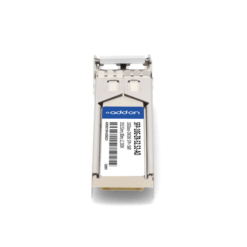 The AddOn Cisco® SFP-10G-ZR-52.52-AO is a high-performance, hot-swappable SFP+ transceiver designed for long-reach 10 Gigabit Ethernet and DWDM network applications. Delivering 10GBase-DWDM throughput up to 80km over single-mode fiber (SMF) using a 1552.52nm wavelength, this module ensures robust, high-bandwidth connectivity in metro, enterprise, and carrier environments.