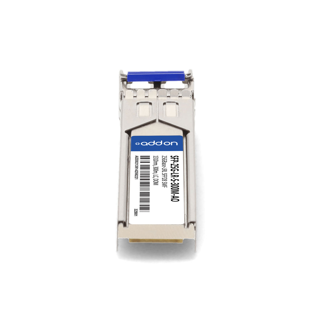 The AddOn Cisco® SFP-25G-LR-S-300M-AO is a high-performance, hot-swappable SFP28 optical transceiver designed for 25GBase-LRL Ethernet connectivity. Delivering up to 300 meters over single-mode fiber (SMF) using a 1310 nm wavelength via a duplex LC connector, this transceiver ensures seamless integration with Cisco® networking equipment.