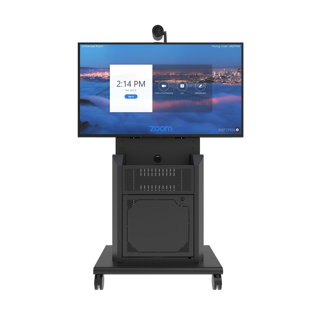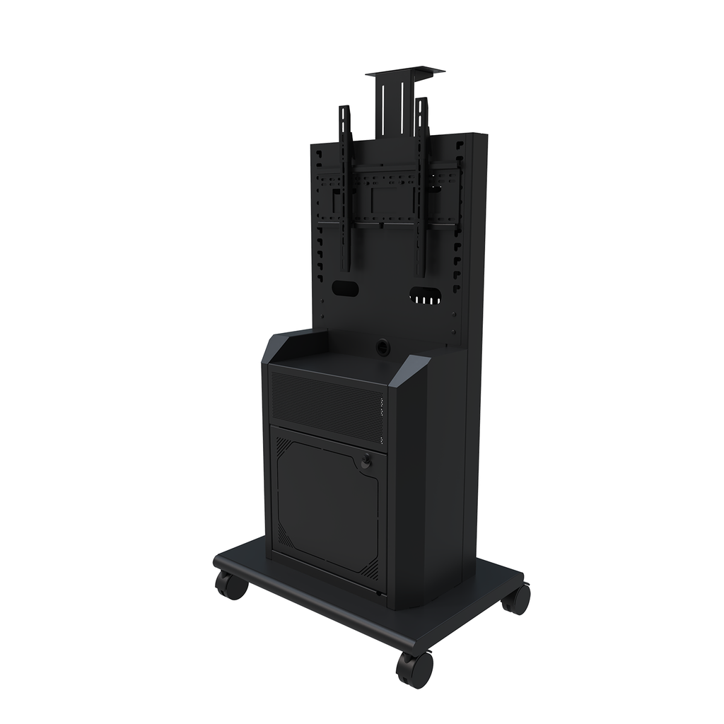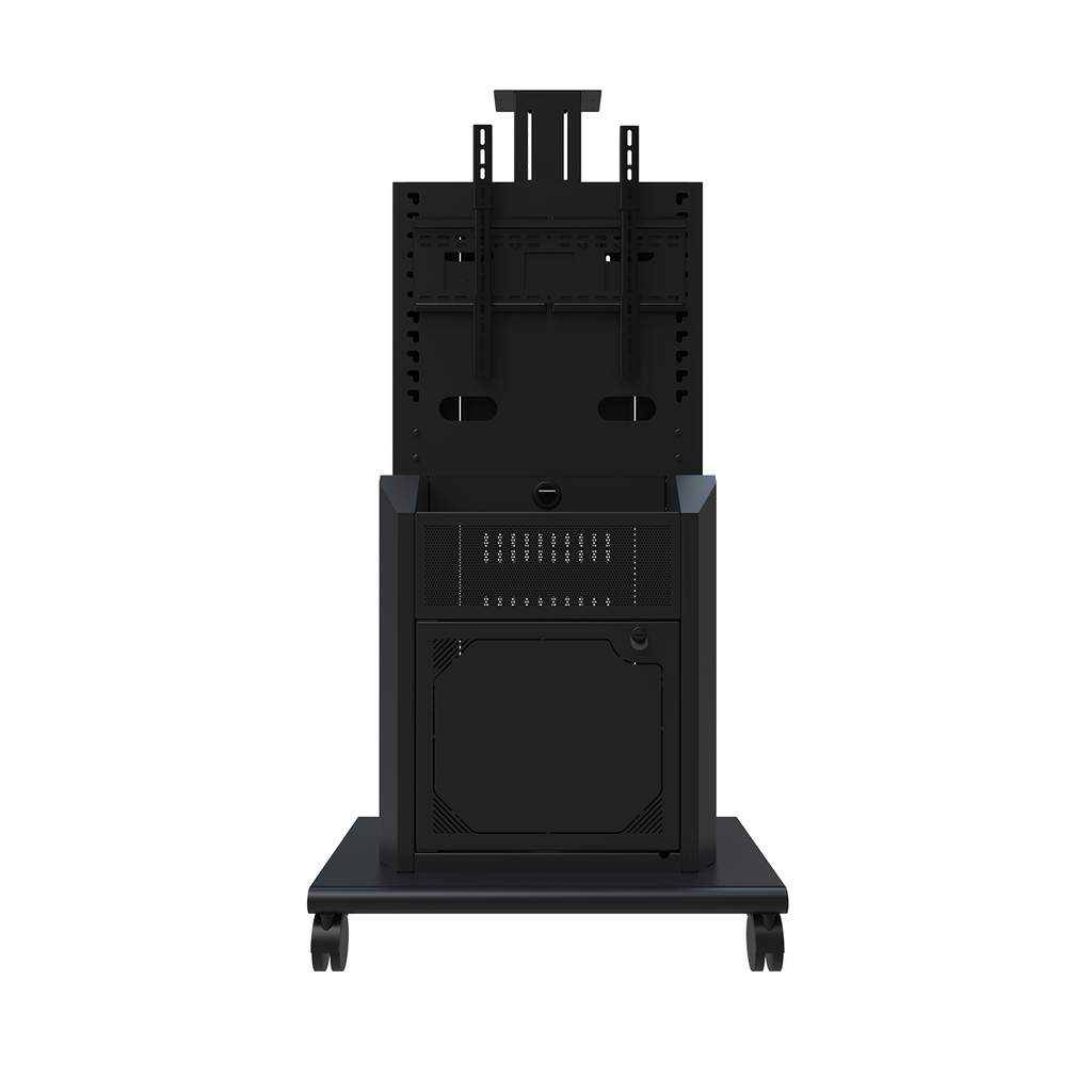 Its integrated 9RU AV storage, locking front door, and dual rear-access panels keep equipment secure yet easily accessible. A built-in shelf beneath the display provides convenient placement for touch panels or other meeting controls, while the adjustable camera shelf ensures optimal positioning for video conferencing.