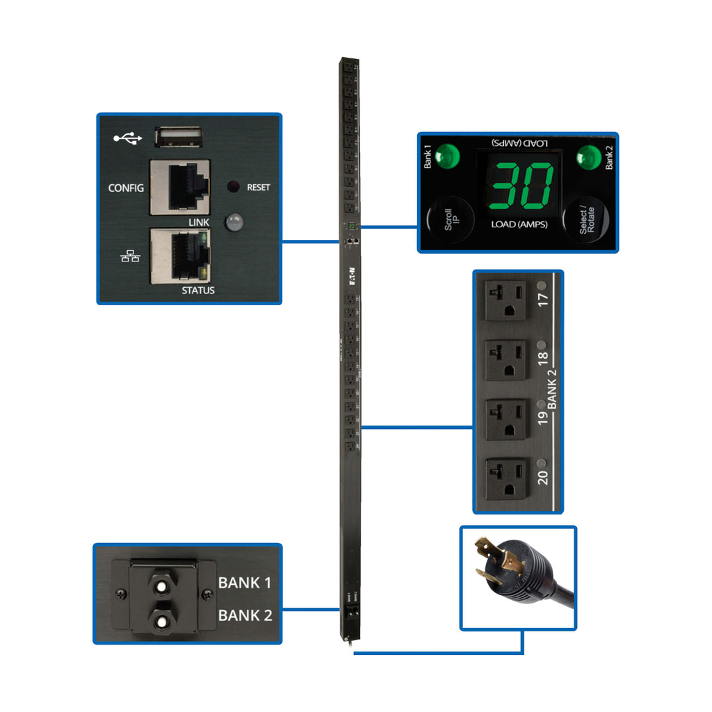 The Eaton Tripp Lite PDUMV30NETLX is a high-capacity, single-phase switched PDU designed for enterprise data centers, network closets, and industrial IT environments that require precise power control and remote monitoring.