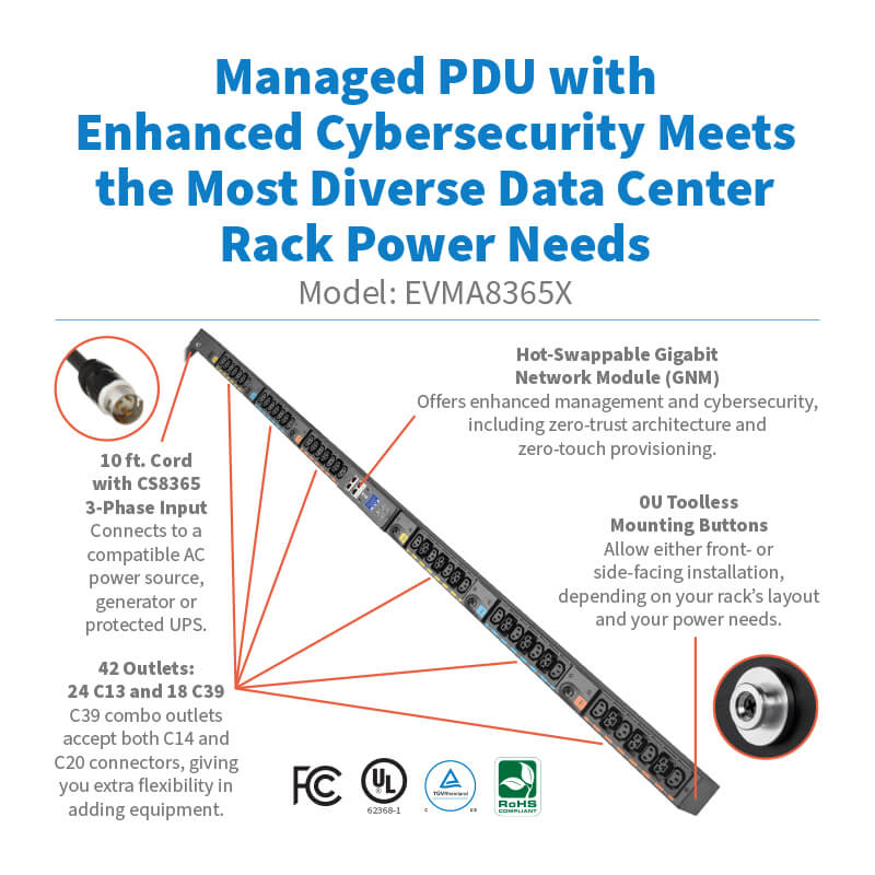 Equipped with Eaton’s hot-swappable Gigabit Network Module (GNM), the EVMA8365X features market-leading cybersecurity, zero-touch provisioning, and real-time monitoring. Outlet-level metering, switching, and six color-coded load banks with individual circuit breakers enable precise control, load balancing, and enhanced uptime.