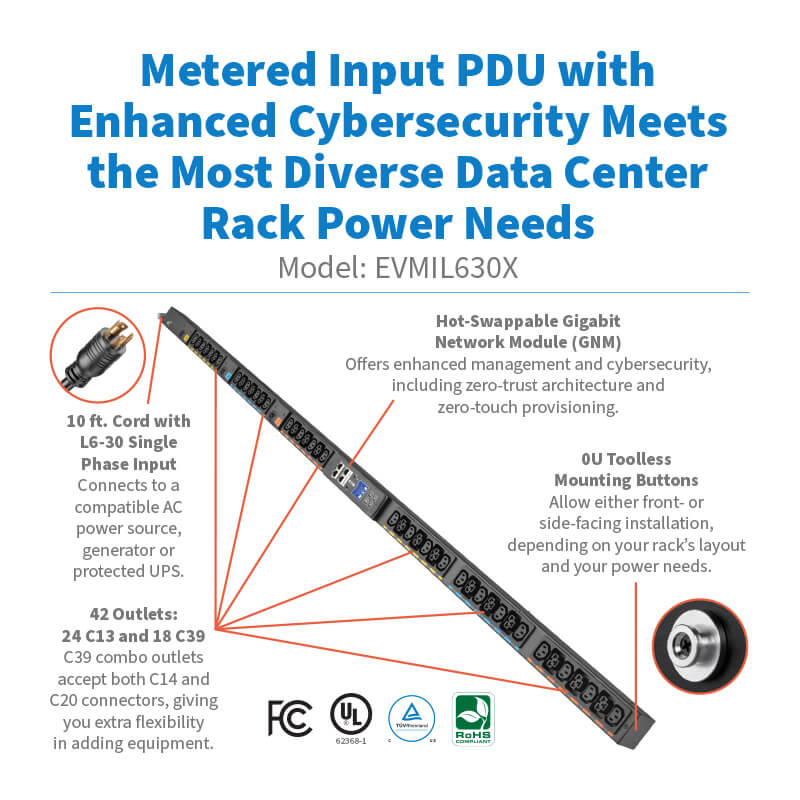 The Eaton EVMIL630X is a Single-Phase Metered Input Rack PDU G4 engineered for data center professionals who demand secure, flexible, and space-saving power distribution. With 42 outlets—24 C13 and 18 universal C39—the unit enables versatile deployments with support for both C14 and C20 plugs. This vertical 0U rack PDU includes enhanced cybersecurity features such as secure firmware boot, zero-trust architecture, and remote management via an embedded gigabit network module (GNM). Designed for easy toolless installation, the EVMIL630X is compatible with global standards and offers accurate energy metering, making it ideal for distributed IT environments and colocation facilities.