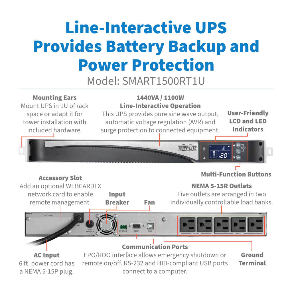 The Eaton Tripp Lite SmartPro SMART1500RT1U is a high-efficiency, line-interactive UPS designed to protect critical IT, networking, and AV equipment from power disruptions. Delivering 1440VA / 1100W of pure sine wave output, this 1U rackmount or tower UPS safeguards servers, switches, VoIP systems, and point-of-sale devices against blackouts, brownouts, surges, and line noise.