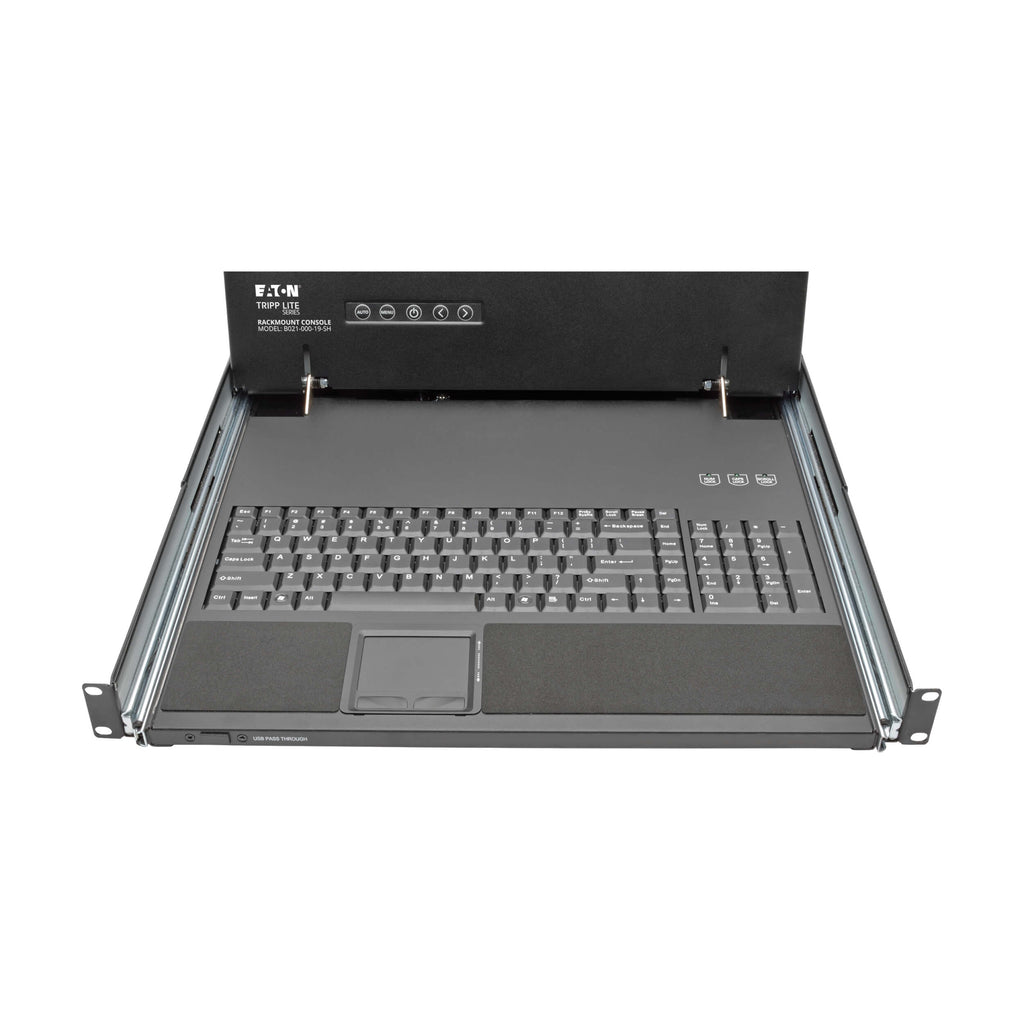 The Eaton Tripp Lite B021-000-19-SH 1U Rackmount Console is a space-efficient control solution designed for compact IT environments and specialized applications such as rescue vehicles or military systems. This short-depth console fits cabinets as shallow as 19 inches and integrates a 19-inch widescreen LCD (1366 × 768 resolution), a full 104-key keyboard, and a touchpad in a single, rugged steel housing.