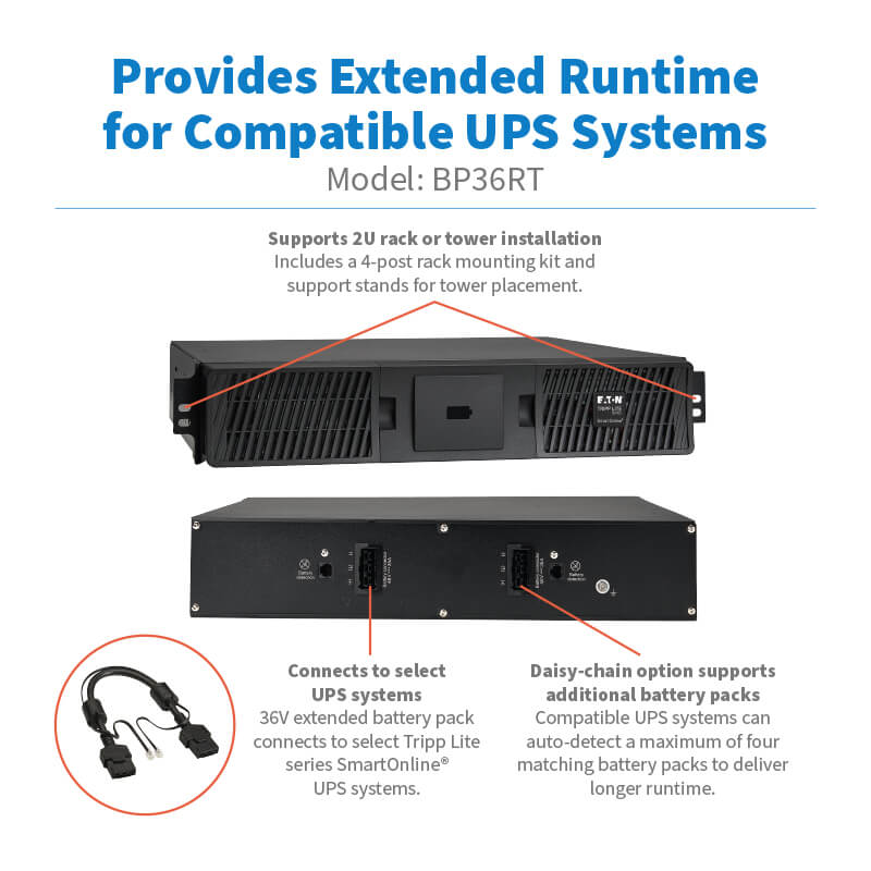 The Eaton Tripp Lite BP36RT Extended Battery Module is designed to provide additional runtime for compatible SmartOnline UPS systems in mission-critical environments. Delivering a 36V DC output, this external battery module ensures continued power protection for servers, networking equipment, and essential electronics during extended outages.