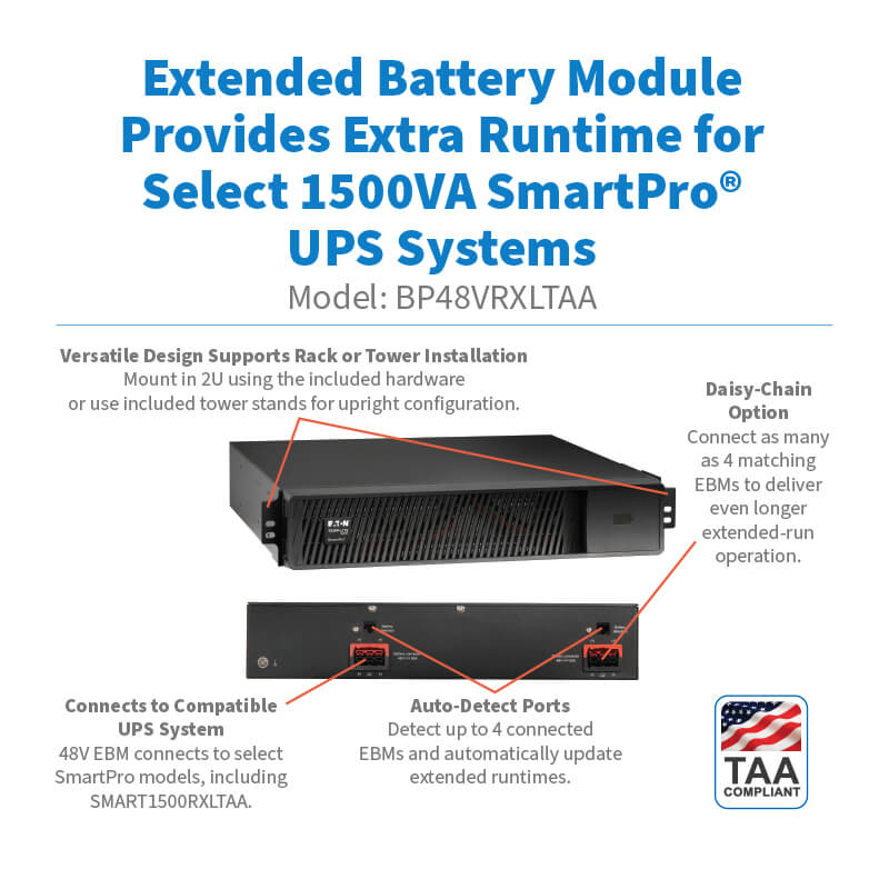 The Eaton Tripp Lite Series BP48VRXLTAA is a 48V extended battery module designed to provide additional runtime for compatible 1500VA SmartPro UPS systems. Ideal for government, military, healthcare, education, and enterprise environments, this external battery pack ensures uninterrupted power during extended outages or critical operations.