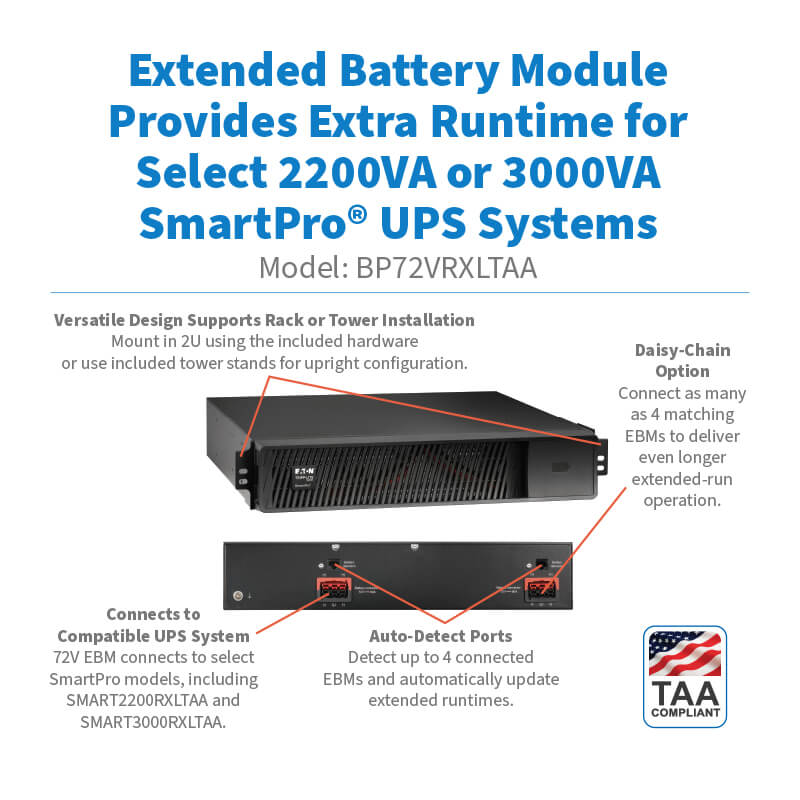 The Eaton Tripp Lite BP72VRXLTAA is a 72V extended battery module designed to increase runtime for compatible 2200VA and 3000VA SmartPro UPS systems in mission-critical environments. Ideal for government, military, healthcare, education, and enterprise deployments, this external battery pack ensures continued power availability during extended outages.