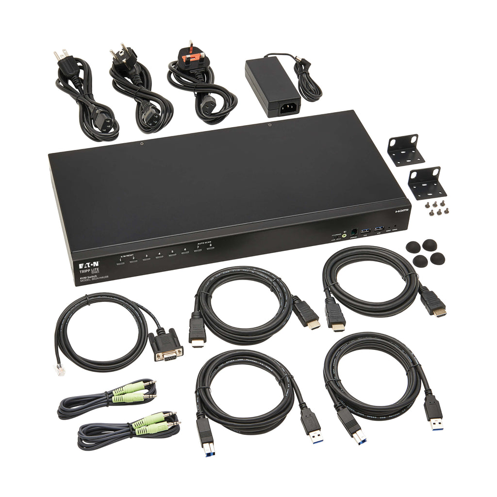The Eaton B024-H4U08 8-Port 4K HDMI/USB KVM Switch lets you control and manage up to eight HDMI-enabled computers or devices using a single 4K monitor, USB keyboard, and mouse. Perfect for server rooms, AV control stations, and multimedia environments, this space-saving 1U rackmount KVM delivers true 4K UHD clarity at 60 Hz and includes a built-in 2-port USB 3.2 Gen 1 hub for sharing peripherals between systems.