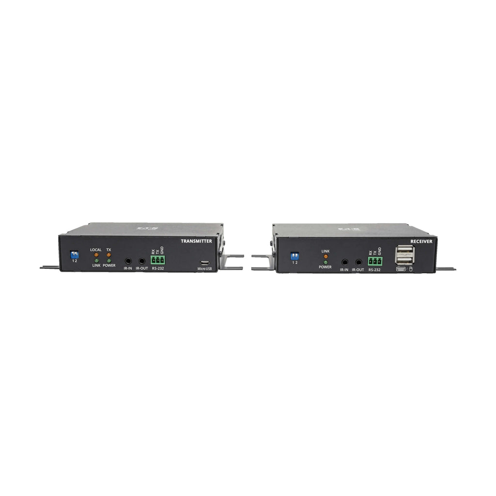 The system features selectable USB 1.1, bidirectional IR, or RS-232 signal extension via onboard DIP switches, allowing flexible control options based on application needs. A local HDMI output on the transmitter enables on-site monitoring without affecting the remote display. Plug-and-play operation, included mounting hardware, and rugged metal housings make this kit ideal for permanent installations in commercial and institutional settings.