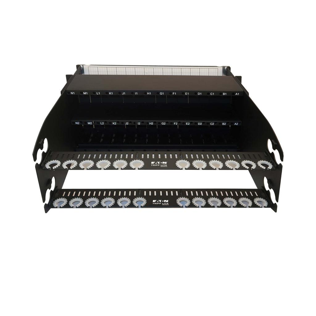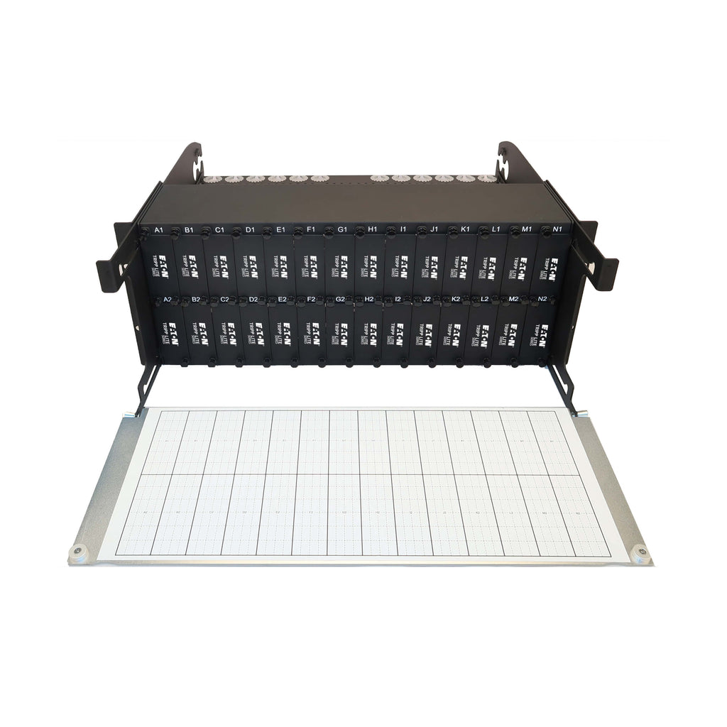 The Eaton Tripp Lite N482-04U is a 4U rack-mount high-density fiber cassette enclosure designed for scalable, high-performance data center and telecom environments. It accommodates up to 28 N482-Series fiber cassettes, enabling support for as many as 336 duplex LC ports (672 fiber connections) within a compact 4U footprint.