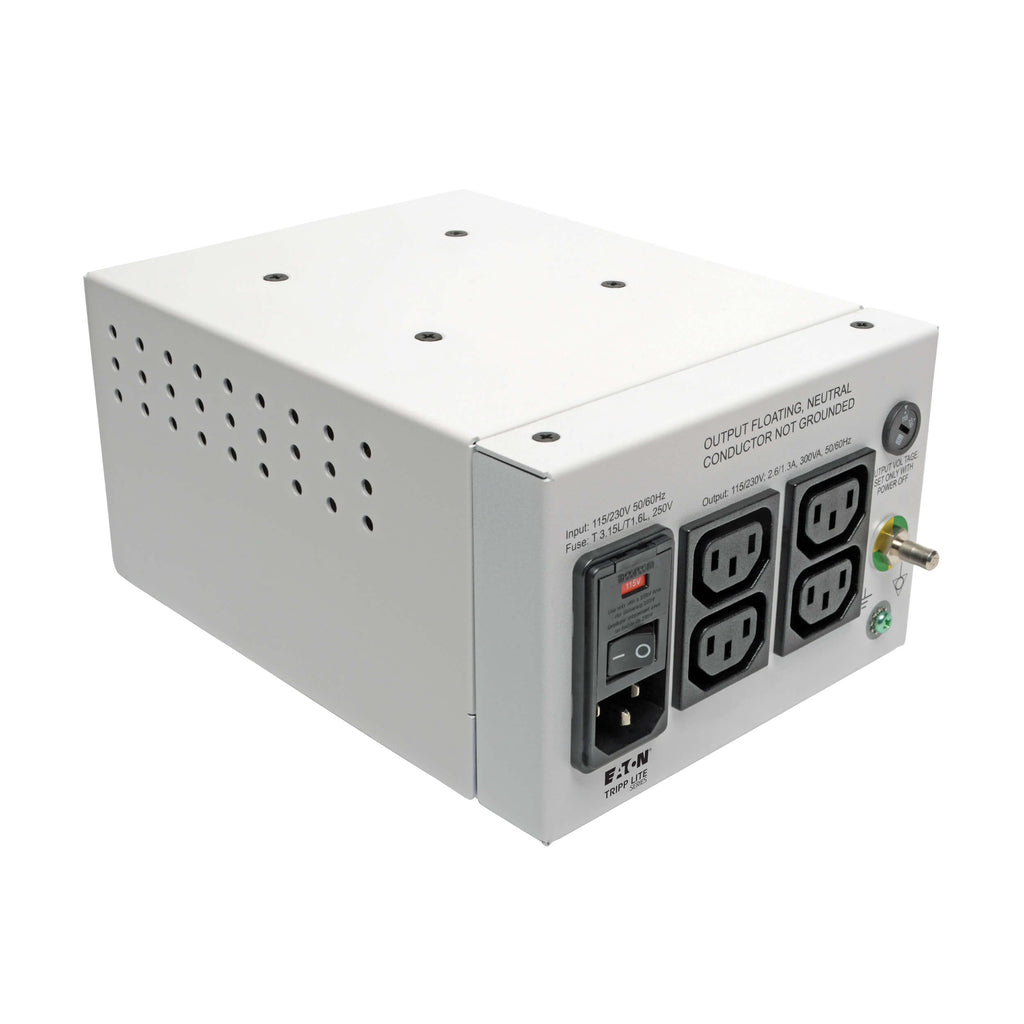The Eaton Tripp Lite IS300HGDV Isolator Series Medical-Grade Isolation Transformer delivers reliable power protection for sensitive electronic equipment used in patient-care and controlled environments. Designed to meet stringent medical safety standards, this dual-voltage transformer supports 115V or 230V operation and provides complete electrical isolation from the input AC mains.