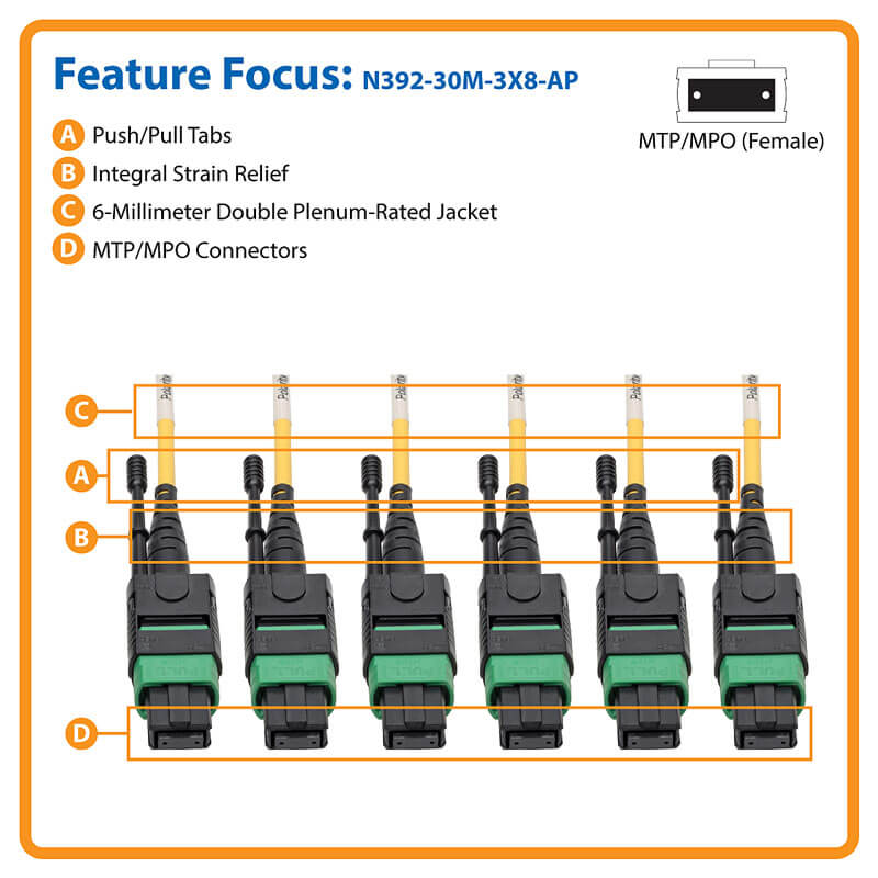 With 24 total fibers arranged in three 8-fiber female MTP/MPO connectors on each end, this cable supports efficient backbone connections between MDFs, IDFs, and network equipment. The plenum-rated dual-jacket design and bend-insensitive fiber make it ideal for installation in ceilings, walls, and raised floors. Push/pull tabs allow fast, tool-free deployment in high-density environments.