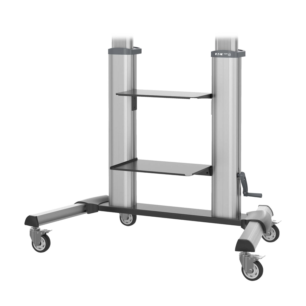 A smooth crank handle allows precise height adjustment to achieve optimal viewing comfort, while the integrated tilt feature helps reduce glare and improve visibility. Locking swivel casters provide effortless mobility between rooms and secure positioning during use. Integrated shelves accommodate AV equipment such as laptops, cameras, and media players, while internal cable routing keeps installations clean and organized.