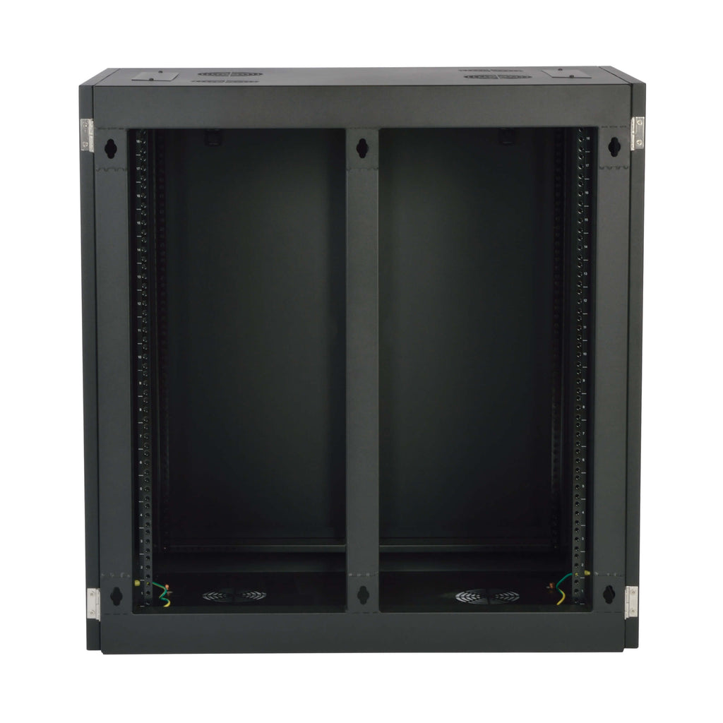 Constructed from durable steel with a black powder-coated finish, this enclosure supports up to 500 lb of equipment, including servers, UPS systems, battery packs, network switches, and patch panels. Locking front and side panels protect valuable hardware, while vented top, bottom, and side panels promote airflow for reliable cooling.