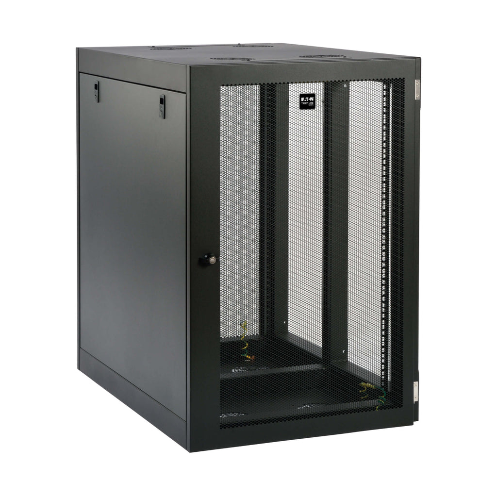 The Tripp Lite SmartRack SRW18UHD is an 18U heavy-duty, low-profile wall-mount rack enclosure designed for secure server-depth installations in space-constrained environments. Its side-mount, low-profile design extends less than 25 inches from the wall while supporting equipment up to 32.5 inches deep, making it ideal for network wiring closets, classrooms, retail back offices, and IT utility spaces.