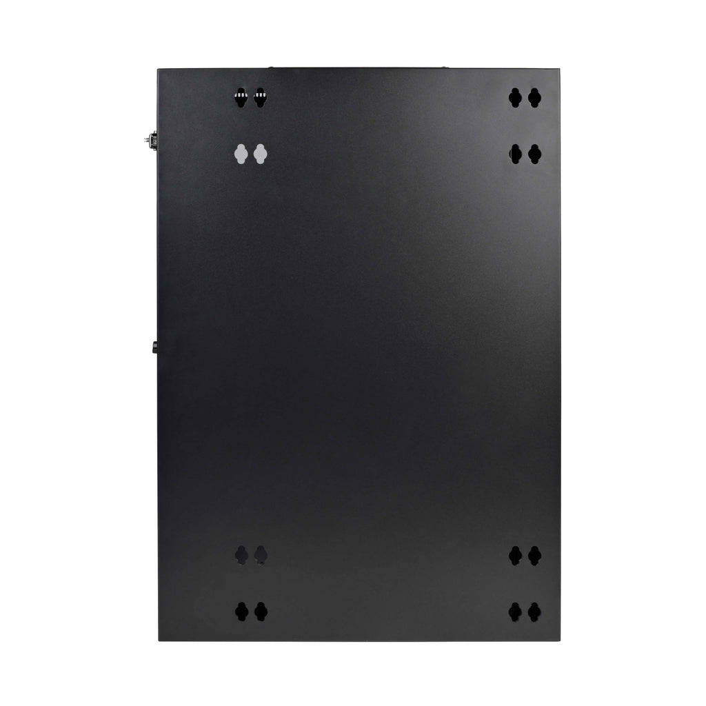 The cabinet features a hinged, swing-away design that provides full rear access for installation and maintenance. Locking front door and side panels enhance security, while vented panels on the top, bottom, and sides promote airflow for proper equipment cooling. Adjustable vertical rails accommodate equipment up to 20.5 inches deep, making this enclosure ideal for switches, patch panels, and network hardware.