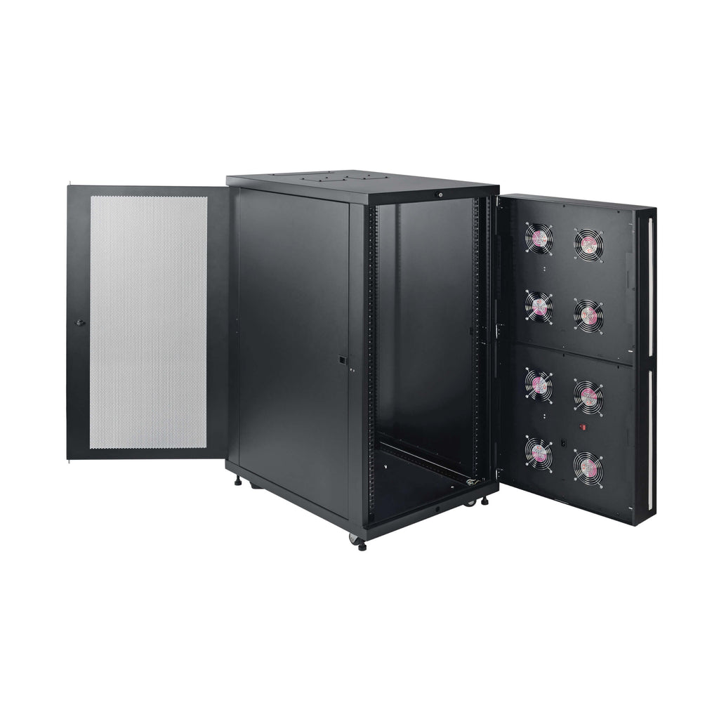 Featuring a heavy-duty steel frame with a durable black powder-coated finish, this rack enclosure supports up to 1000 lbs (453.6 kg) and complies with IP54 protection standards. Its louvered front door and replaceable dust filters block airborne contaminants, while eight high-performance cooling fans ensure optimal airflow. The reversible locking doors and removable side panels enhance security, and adjustable mounting rails simplify equipment installation.